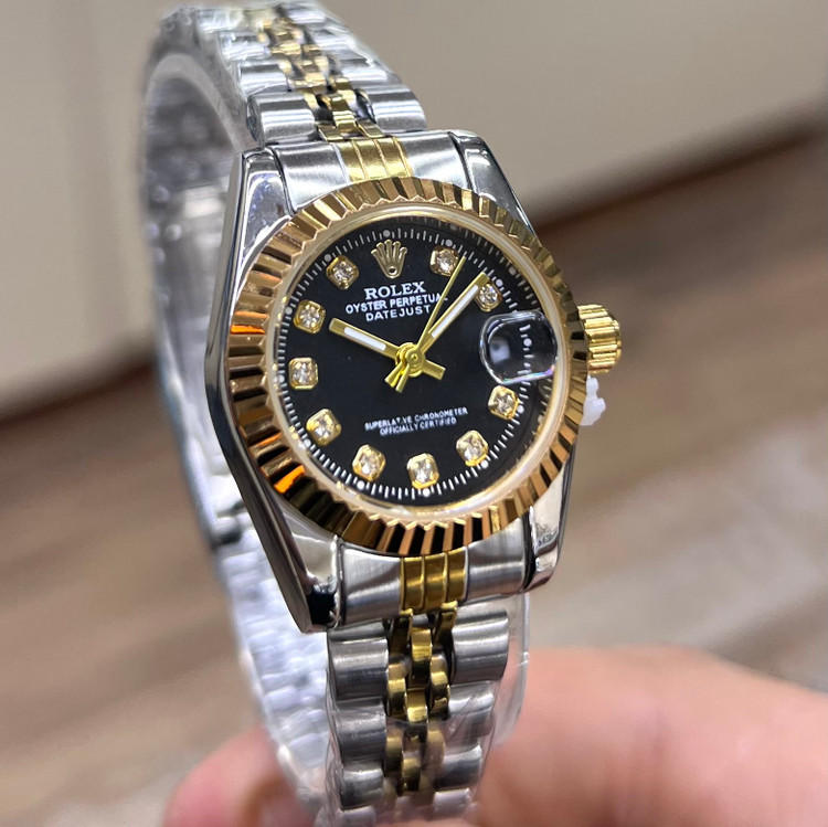 ساعت مچی زنانه رولکس دورنگ طلایی صفحه مشکی رنگ ثابت